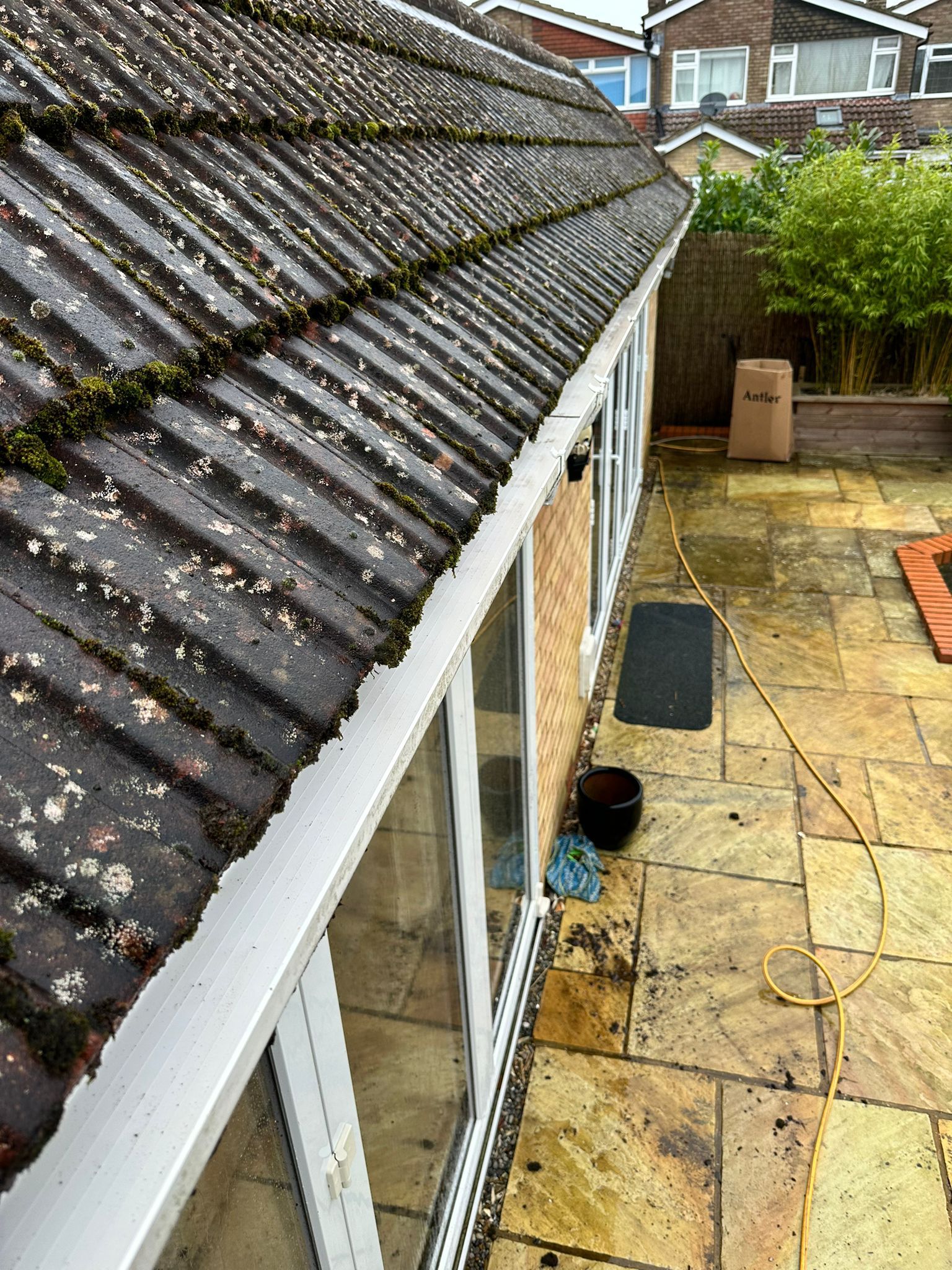 Heavily blocked roof valley shown before gutter clearance service